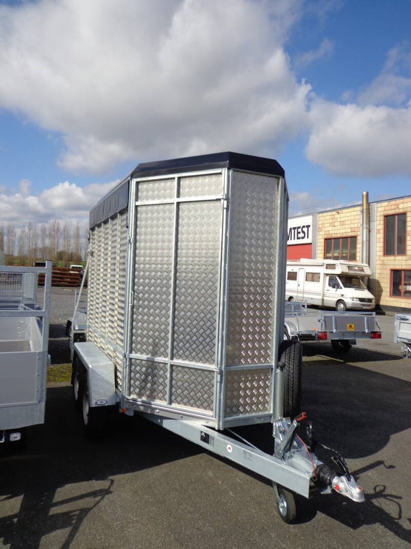Dieren ahw Geremd 3000x1570 of 3300x1860 2 assen HTG 2600 - 3000 - 3500kg Zijkanten bekleed met alu traanplaat Inspectiedeur vooraan Achterval met veer Binnenlicht Geschilderde dakrand Incl. neuswiel en reservewiel Alu bodem antislip Alle metalen warmbad verzinkt